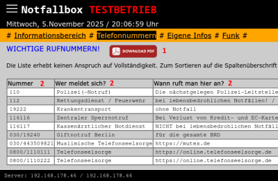 Dieser Bereich beinhaltet eine Liste von Telefonnummern, welche durch den Administrator gepflegt und ergänzt werden können. Ab der Installation sind einige bundesweite Standard-Rufnummern vorhanden. Schliesslich muss nicht jede Krise oder Katastrophe mit dem Ausfall sämtlicher Telefonnetze einhergehen.