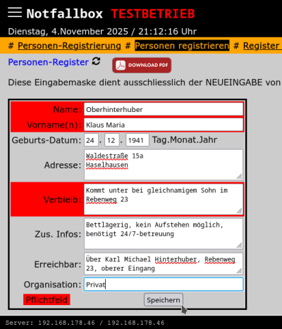 In dieser Maske kann ausschliesslich eingetragen werden. Wer schon einmal mehrere 10 bis 100 Personen eingetragen hat, weiss es zu schätzen, dass er keine sonstigen störenden Elemente findet. Dennoch kann man per PDF-Button jederzeit die aktuell gespeicherten Register-Einträge in Form eines druckbaren Berichtes ausgeben lassen.