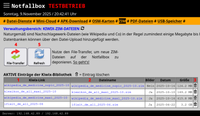 - Mit dem File-Transfer können neue ZIM-Dateien auf der Notfallbox platziert werden.