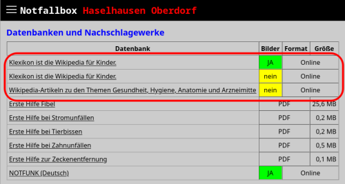 Wir bieten hier eine Liste von Wiki-Datenbanken an, welche nach Stichworten durchsucht werden können - und zwar während dem man mit der Notfallbox verbunden ist. Welche Wikis genau verfügbar sind, entscheider der Administrator. Bei der Installation der Notfallbox wird jedoch ein kompletter Auszug der deutschen Wikipedia, und zwar aller medizinischen Artikel, komplett mit Bildern.