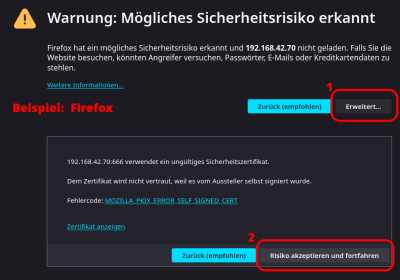 Manche Browser bemerken ein angebliches Sicherheitsrisiko, weil der SSH-Zugriff hier mit einem „selbst-signiertem SSL-Zertifikat“ durchgeführt werden soll. Daran stören wir uns NICHT!