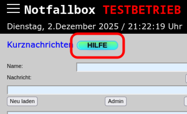 In vielen Seiten der Notfallbox wird nun über einen Button HILFE angeboten. Klickt/Tippt man diesen an, öffnet sich ein neues Fenster oder ein neuer Tab. Die Hilfe entspricht dieser Online-Dokumentation - ist aber auch ohne Internet nutzbar!!!