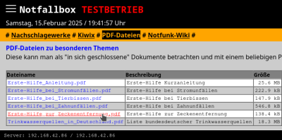 Besondere Informationen (z.B. Erste Hilfe-Anleitungen, Liste bundesdeutscher Trinkwasserquellen) haben wir in Form von PDF-Dateien bereits mitgeliefert. Der Administrator kann diese jederzeit ergänzen mit weiteren wichtigen PDF-Dateien.