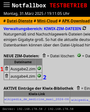 Neue ZIM-Dateien können hier entweder gelöscht (1) oder freigegeben (2) werden. Die Dateibeschreibung wird der ZIM-Datei selbst entnommen und ist daher nicht änderbar.