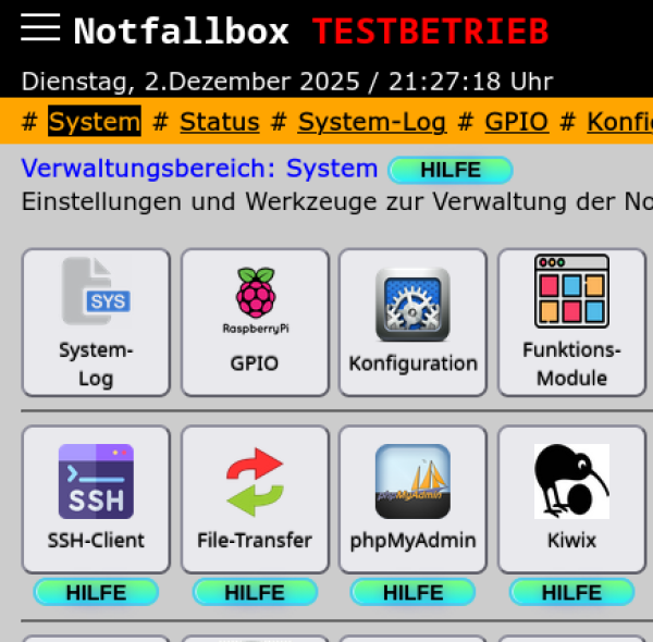 Die Notfallbox ist inzwischen erwachsen geworden. Im Gegensatz zur Notfallbox Mini kann diese inzwischen „richtig viel“ - und bedarf daher natürlich auch einiger Verwaltung, welche logischerweise mit jeder neuen Funktion im Umfang gewachsen ist.