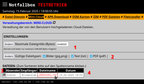 Jeder Benutzer kann Dateien in die Mini-Cloud laden - und jeder kann diese dort herunterladen. Es gibt keinen Benutzer- und Verzeichnisschutz. Es sollen lediglich schnell und einfach Dateien ausgetauscht werden können.