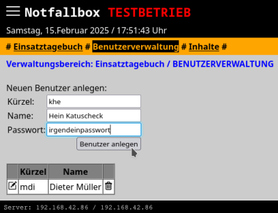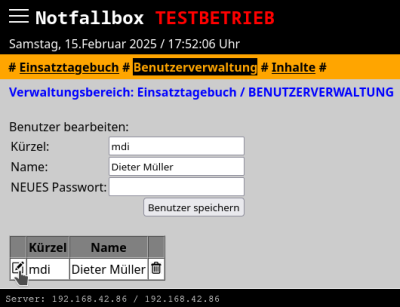 Hier werden die Benutzer angelegt und verwaltet. Als Nutzerkennung wird ein Kurzzeichen verwendet und dieses in der Benutzertabelle der Datenbank auf den vollständigen Nutzernamen (und natürlich das Passwort) referenziert, so dass nur die korrekte Kombination aus Kurzzeichen und Passwort zum Speichern eines Eintrages berechtigt.