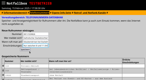 Eine einfach zu pflegende Liste mit Telefonnummern, welche zu allen Zeiten hilfreich sein können. Diese Nummern können vom Verwalter jederzeit ergänzt oder gelöscht werden. In der letzten Spalte kann man eine räumliche Einschränkung geben - z.B. wenn eine Bürger-Hotline nur für einen bestimmten Einzugsbereich gelten soll - oder nur zu bestimmten Uhrzeiten besetzt ist.