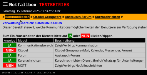 Dieser Bereich verwaltet die Benutzer-Funktionen für die Kommunikation. Diese können mit JA angezeigt und NEIN verborgen werden. Die Funktionen sind im Einzelnen: