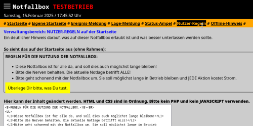 Diesen Bereich kann man dafür nutzen (haben wir so vorgesehen) um potentiellen Nutzern ein paar Regeln mit auf den Weg zu geben, wie sie die Notfallbox benutzen können. Natürlich kann hier alles mögliche und unmögliche notiert werden. Wir finden aber, dass es sinnvoll sein kann, Nutzer darauf hinzuweisen, dass die Notfallbox für ALLE da ist und daher zerstörerische Aktionen nicht willkommen und auch nicht sinnvoll sind.