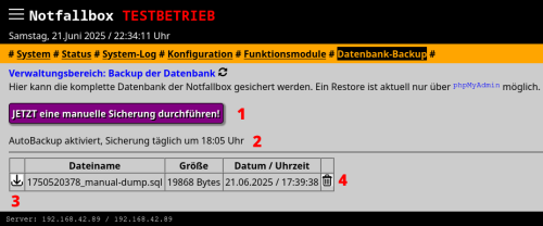 Im Hintergrund der Notfallbox läuft ein relationaler Datenbank-Server (MariaDB, ein MySQL-Derrivat). Hier sind alle Einstellungen, Parameter, Eingaben, Texte etc. hinterlegt, mit welchen die Notfallbox arbeiten muss - sprich: Parameter und variable Daten. Aus Sicherheitsgründen wird ein Restore nur über phpMyAdmin möglich sein und bleiben (vielleicht zukünftig über das Setup).
