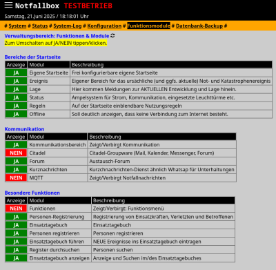 Inzwischen kann die Übersicht der ein- oder ausgeschalteten Funktionsmodule über einen Button (nicht im Bild) als druckreife PDF heruntergeladen werden.