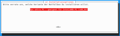 - Wir wollen eine „große“ Notfallbox installieren und wählen daher Xpc aus. Mehr Auswahl haben wir auf einem PC sowieso nicht