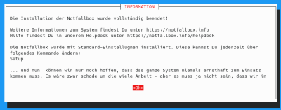 - Mit der Schlussmeldung ist die Notfallbox fertig installiert. Diese wird - nach dem Klicken auf „OK“ noch einmal final neu gestartet.