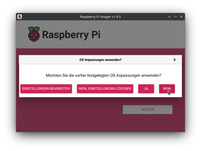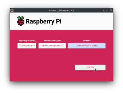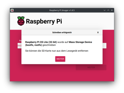 - Nach dem Ende die Speicherkarte / den USB-Stick vom Programmiercomputer entfernen (wurde automatisch ausgeworfen) und in den PI einsetzen.