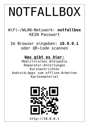 … zum Feuerwehrhaus Deines Dorfes, Deines Stadtteils. Dort entdeckst Du ein offenes WLAN-Netz. Du verbindest Dich mit diesem Netz - und erfährst zuerst, was genau los ist, und dann, dass Du in diesem WLAN-Netz ein paar Android-Apps findest - z.B. mit der Wikipedia und Offline-Karten!